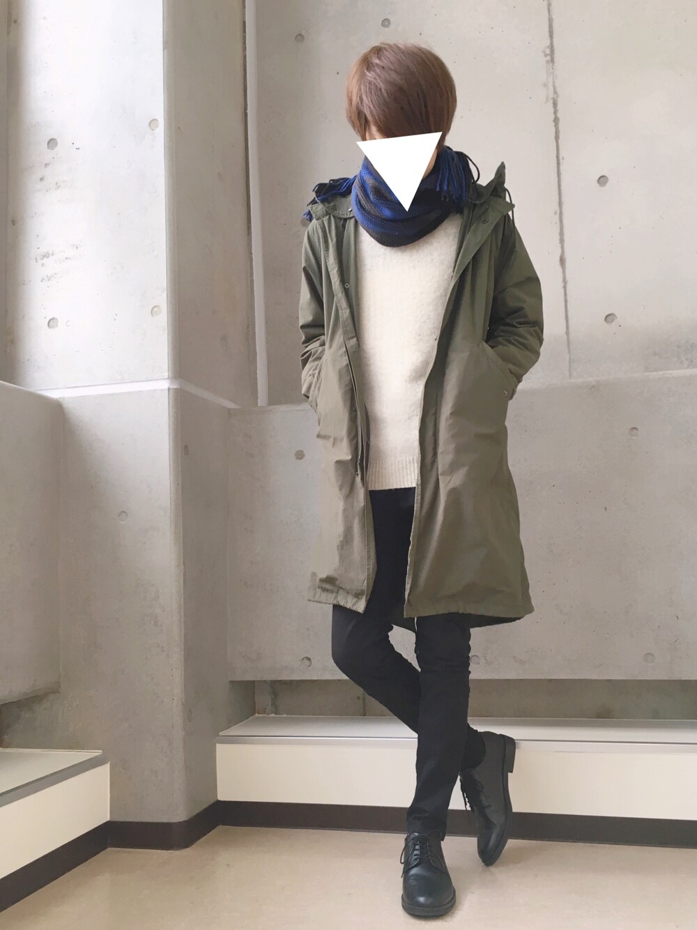 きれいめカジュアル🤓 モッズコート 白ニット 黒スキニー プレーントゥシューズ カーキ&ホワイト&ブラック