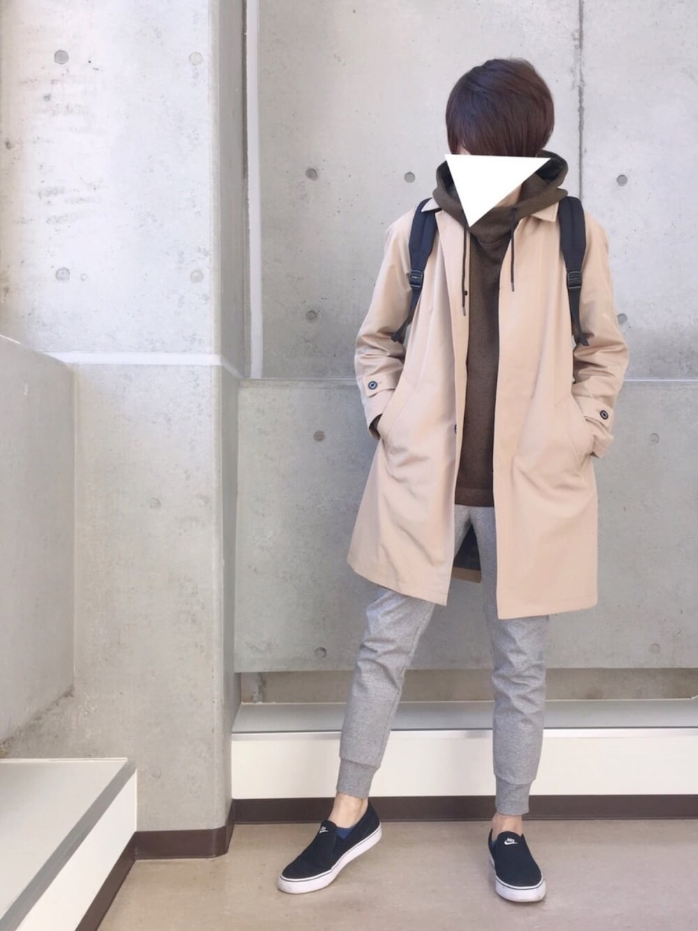 カジュアルmix ステンカラーコート M パーカー M スウェットパンツ S スリッポン ベージュ&カーキ&グレー&ブラック