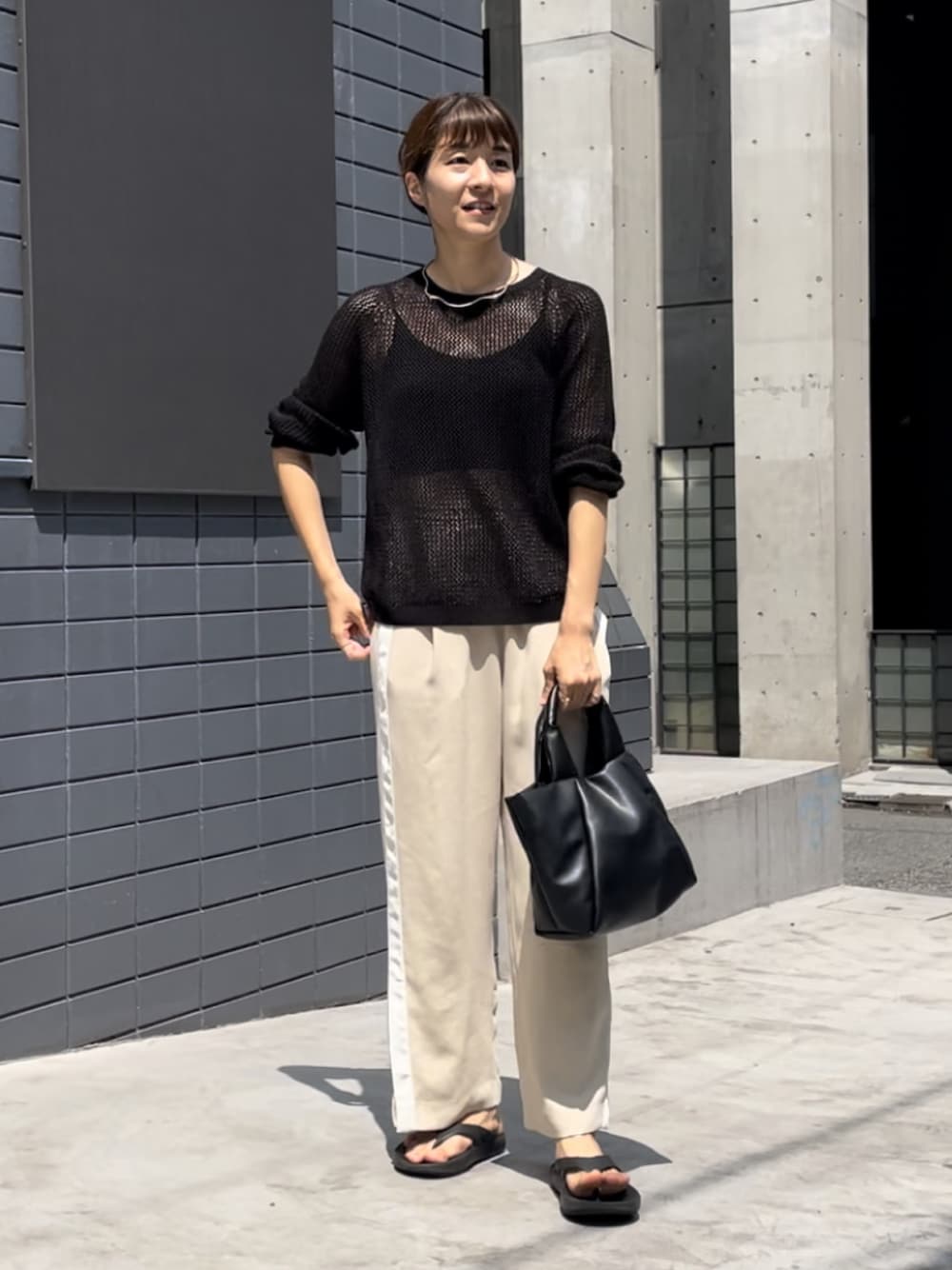 UNIQLOの新作メッシュセーターが お気に入り🫶 夏セールで買ったキャミソールと合わせてモノトーンスタイルの完成! バッグはもうすぐ発売の新作デス。 ◯トップス UNIQLO 3DメッシュクルーネックセーターLサイズ(159cm) ◯インナー UNIQLO シームレスハーフブラキャミソールSサイズ