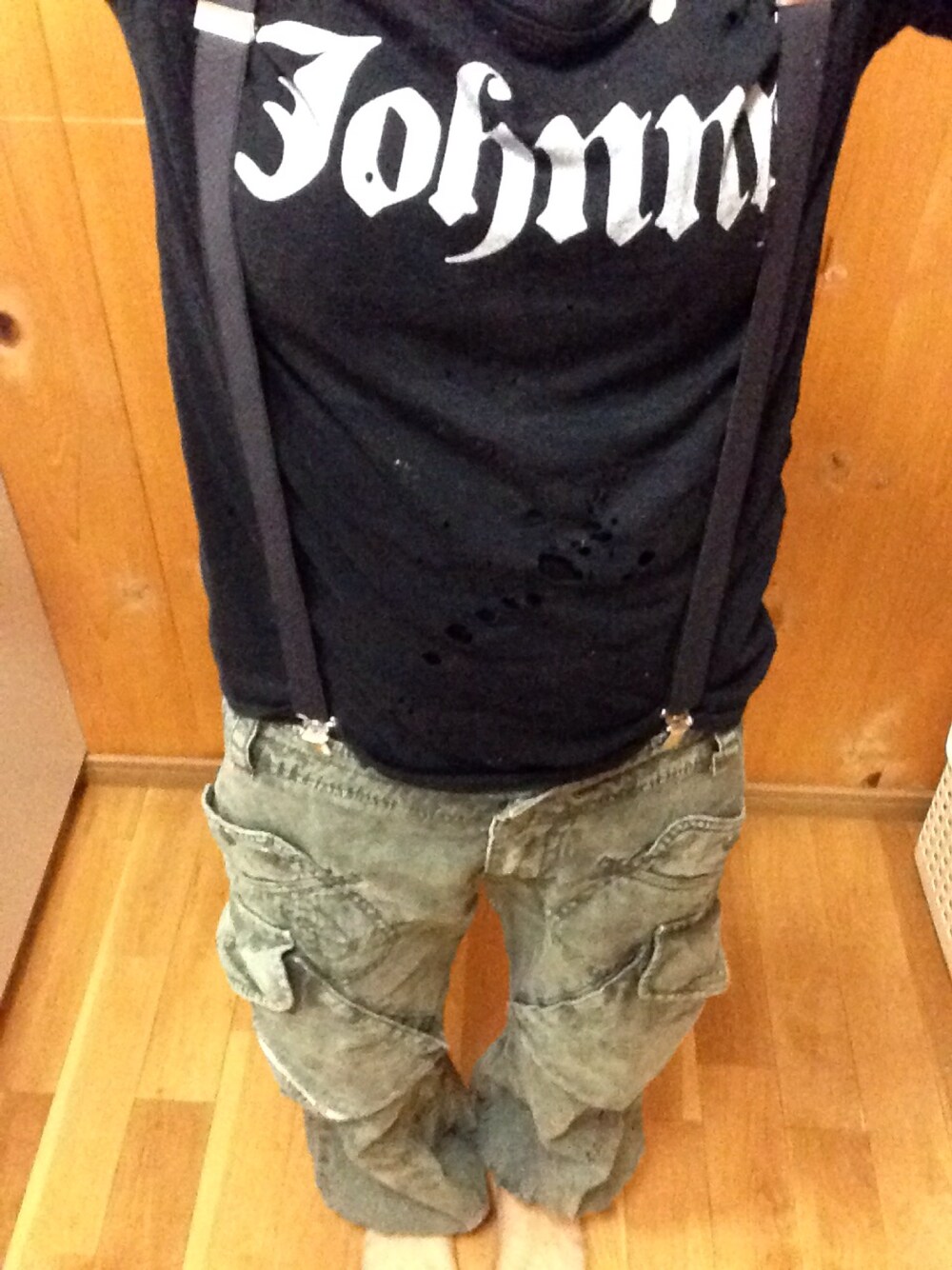 いつぞやのラクチンコーデ。サスペンダーがないとずり落ちる。育児中はそれは命取り。