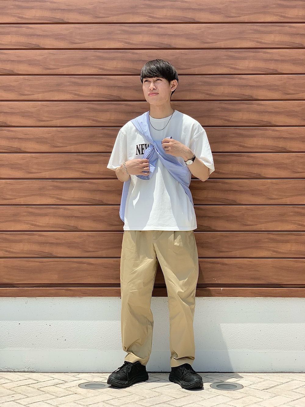 夏のカジュアルスタイリングです! オーバーサイズの白Tにワイドパンツを合わせた休日スタイル🚶♂️ ストライプシャツのたすき掛けが良いアクセントに🟦