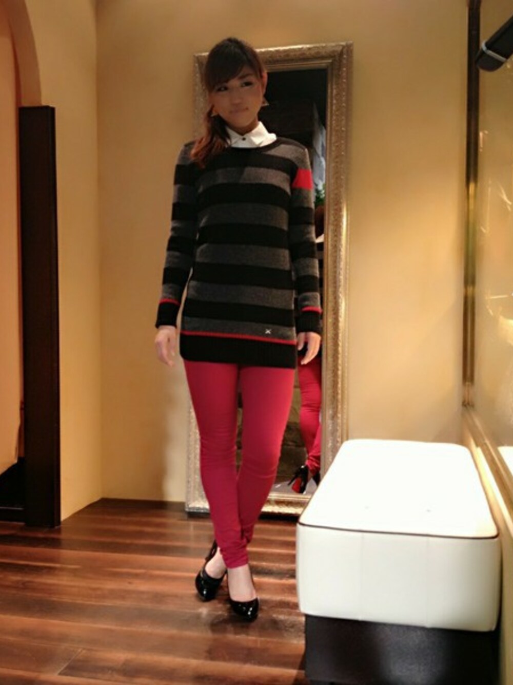 細身なシルエットのニットなのでアウターの下でも着膨れしません。 カラーパンツ今年トレンドのワインレッド系でコーディネートのポイントに。