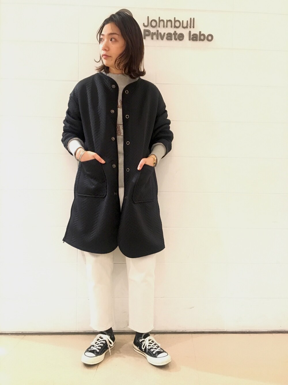 新作の春まで使えるキルティングコートは黒が人気! ロゴスウェットやパーカーとカジュアルに 合わせたい。