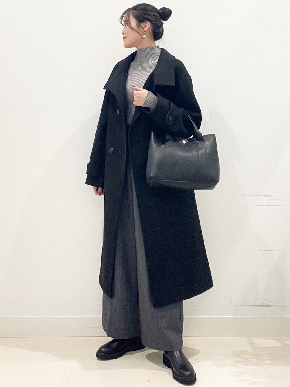 スタンドカラーのロングコートは スタイルが良く見えます◎ 身長167㎝でMサイズ着用 しっかりと長さがあり 高身長さんにもおすすめです♩ ワイドパンツもMサイズ着用 ワイドですが、センタープレスなので すっきりとした印象に見えます◎ ブーツはロングタイプで サイドゴアなので履きやすいので おすすめです◎