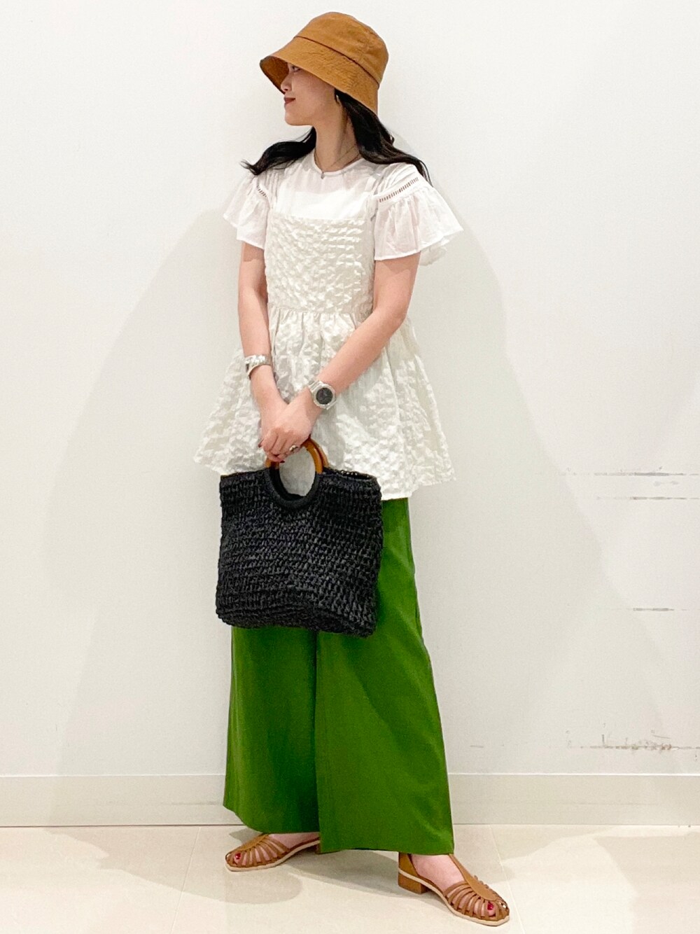 鮮やかなグリーンが目を引く とってもきれいなカラーのパンツ♩ リネンレーヨンで夏に涼しく ぴったりな生地感です◎ ウエストはゴムで嬉しいストレスフリー◎ WEBと一部店舗限定のハットを 着用させて頂きました!♩ つばは広めでUV機能付きで日焼け対策にも◎ 幅日のなので顔が小さく見えます◎ ストラップがついているので前につけると よりカジュアルなアイテムとして楽しめます! 軽いので疲れる心配もありません◎ 明るめのブラウンで夏にぴったりです♬ ハットコーデ最後の4コーデ目♩ ぜひチェックしてみてください!