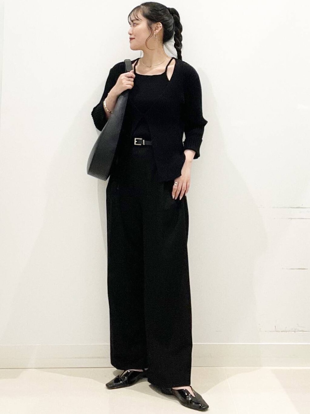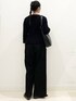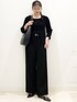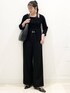 春でもやっぱりブラック!コーディネート♪ リアル出勤コーデ♪ アンサンブル風なので1枚で おしゃれにお出かけできるニット◎ デコルテが見えるので抜け感も◎ パンツはウエストゴムで楽ちん◎ イージーケアなので お手入れもしやすいパンツです!