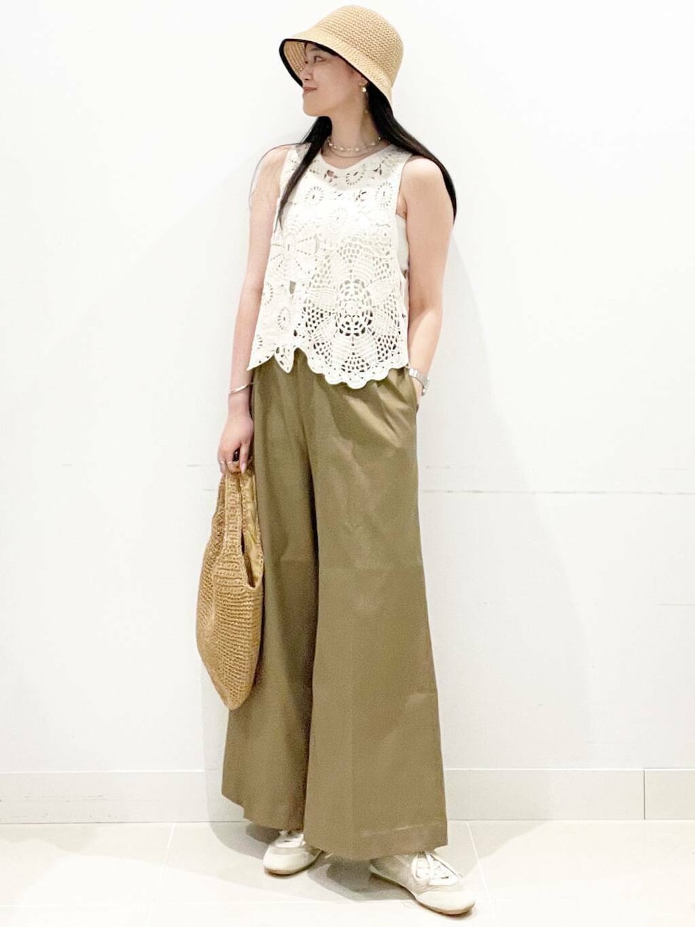 mai(SENSE OF PLACE ららぽーと沼津)のトートバッグ「コマ編みペーパートートバッグ」を使ったコーディネート