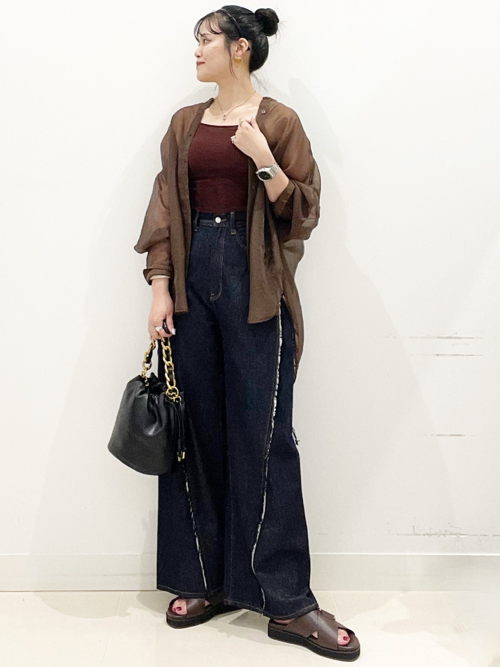 晩夏を楽しむシャツコーデ♩ 今年のシャンブレーシャツは 晩夏を楽しむカラーがいっぱい◎ 特にこのブラウンが私のおすすめカラーです! インナーもブラウンにして統一感! パンツを暗めのカラーにしてすっきりと♩ デニムはフリンジの入った デザイン性の高いパンツです! 高身長さんにおすすめデニムです♩