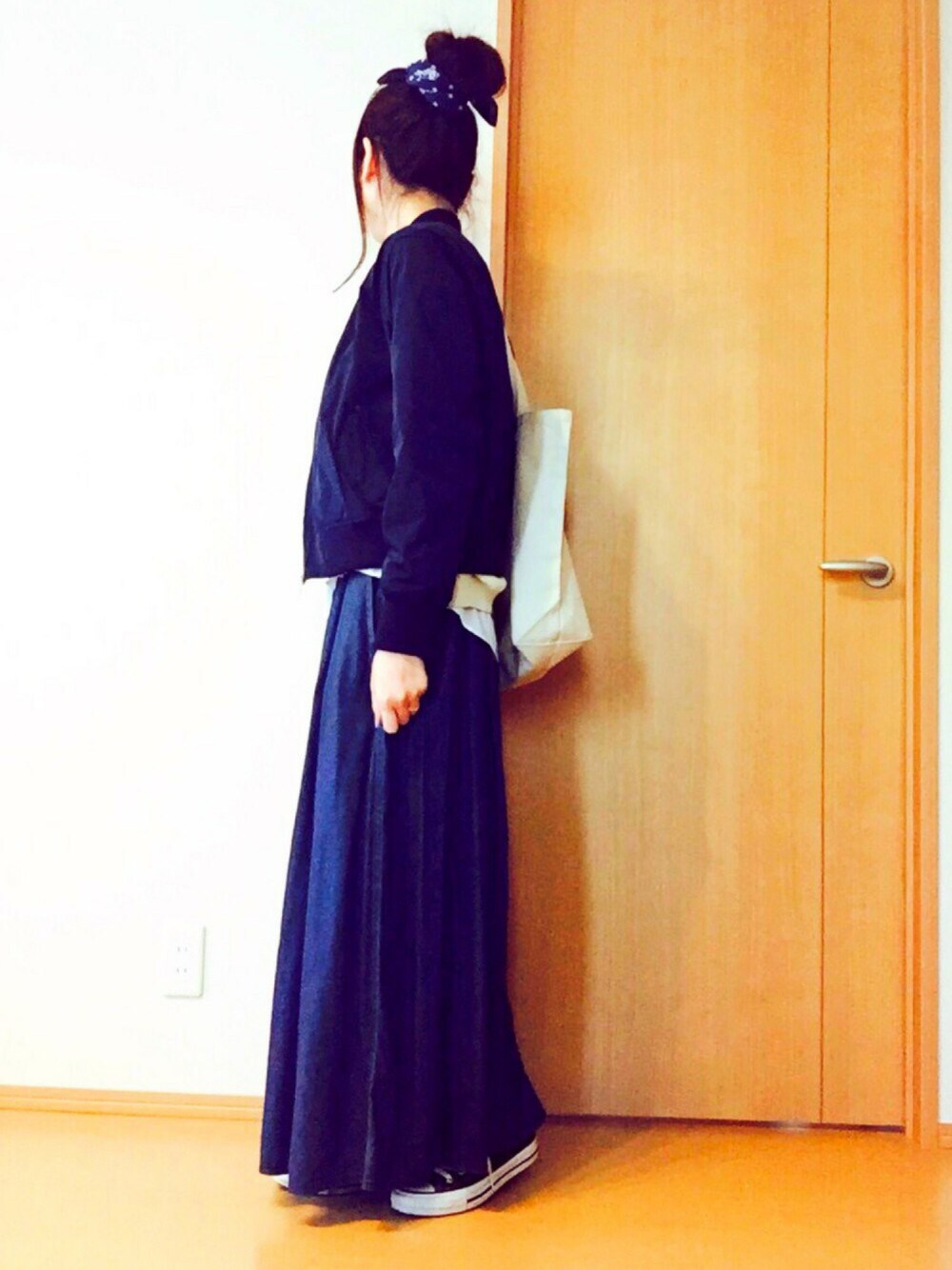 こんにちは・:* ೫̥♡* 今日はネイビーコーデです。 バッグは京都のお洒落スーパー 八百一のエコバッグです。イラストが可愛い♡ 六角堂の近くにあります。 他県のスーパー行くの好きです。 そこの土地ならではの物が売っていて 楽しいですよね(๑´ڡ`๑) って、コーデの話からそれちゃいました。笑