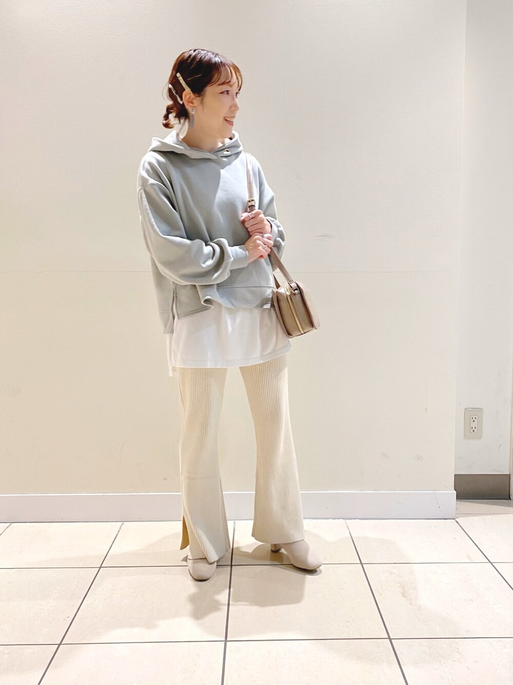 リラックス感のあるフーディーを、レイヤードスタイルで着てみました。ボトムはニットパンツなのでおうち時間にも取り入れやすいファッションです☻