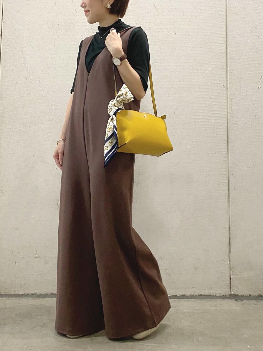 ブラウン×ブラックで秋カラーのコーディネート。 柔らかいポンチ素材のオールインワンは、着るだけでオシャレ見えする便利アイテム! 着心地抜群なのに、上品にも見えて、オススメです☻