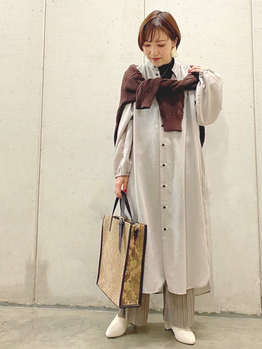 スタッフ人気抜群!の、シアー感のあるシャツワンピースが主役のレイヤードスタイル。 合わせたプリーツパンツは、なんと、裾をお好きな長さにカットして、切りっぱなしのままで履いて頂けるので、 低身長さんにもオススメ! 身長を選ばずどんな方にもお召し頂けます。 ニットを肩掛けすることで、暖かさをプラス。スタイルアップも叶います。 ジャガード柄のトートバッグは、合わせるだけでコーディネートのアクセントに。