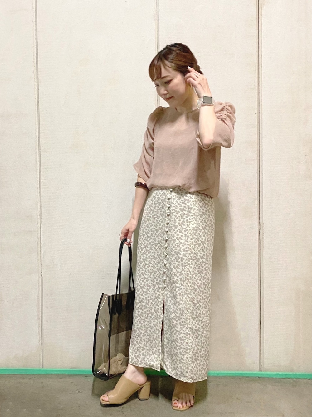 くるみボタンがアクセントの、夏らしい涼しげな花柄スカートに、シアートップスを合わせたトレンド感あるコーデ。ベージュカラーのワントーンコーデに仕上げました。 シアートップスはお袖のデザインが可愛くて、一枚で主役になれるアイテムです。