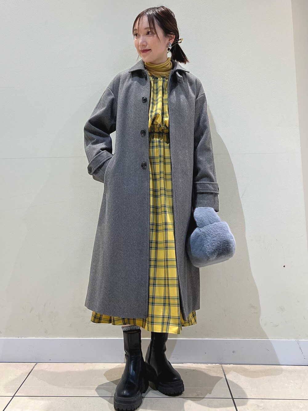 午後の紅茶コラボワンピ♪レモンティーをイメージした、黄色のチェックが可愛い◎ ヘリンボーンのコートは着るだけでこなれた印象に。