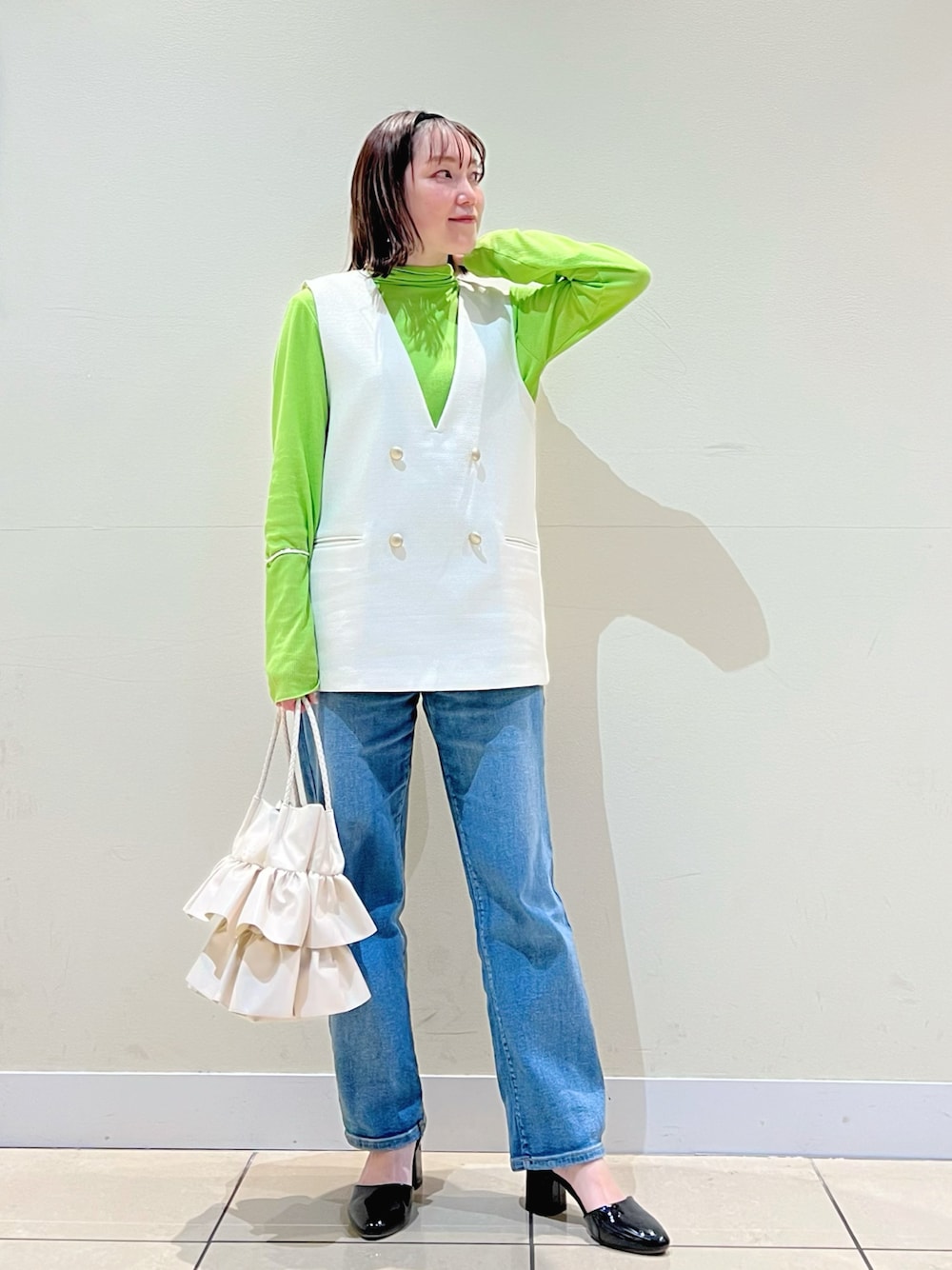 今季も引き続き人気のシアータートルは柔らかくて抜群の着心地◎。 色違いでもリアルバイしているくらいにお気に入りのアイテムですが、これ1枚あれば、着回し抜群で本当に大活躍です! ベストと合わせれば春らしいカラーコーデに。