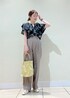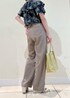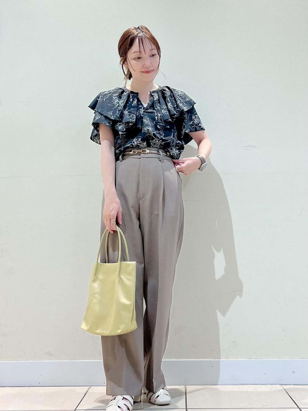 接触冷感で涼しいパンツは、ほんのりキレイめで、オンにもオフにも大活躍! フリルブラウスを合わせて、通勤にもお出かけにもぴったりな万能コーデです。