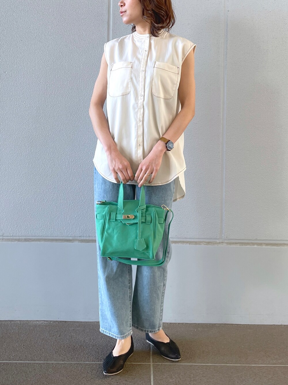 配色ステッチデザインが可愛いブラウスコーデ⸜ ♡ ⸝ノースリーブ過ぎない袖丈がお気に入り!!デニムで大人カジュアルコーデ!