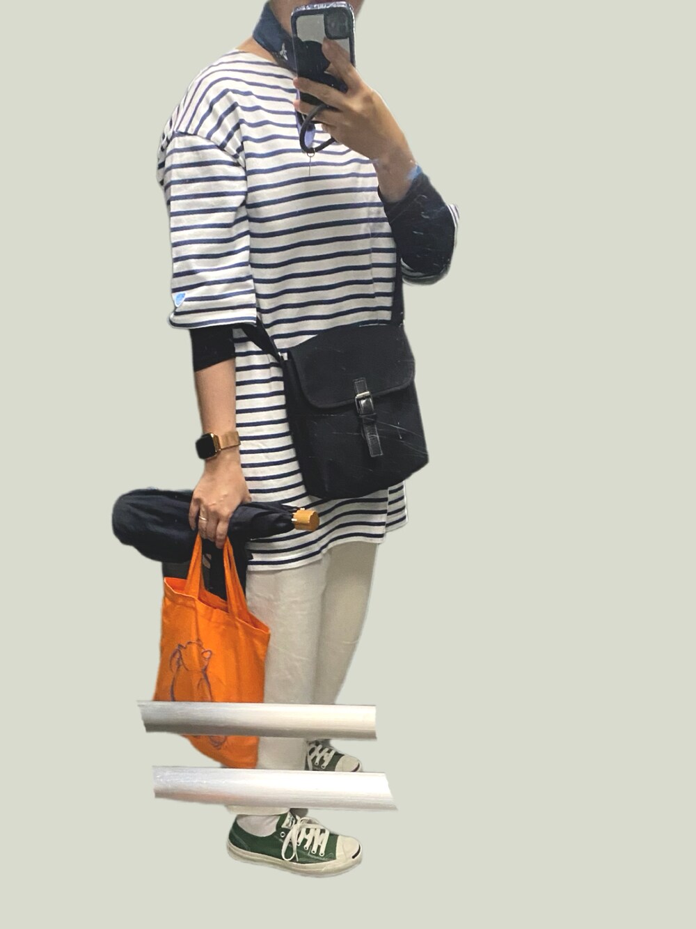 今日はマリンな気分〜(*´∀`) オレンジのPooh bagが映えとる♪ 朝はまだ爽やかな気温だけど 動くとすーぐ暑くなっちゃうから 駅までそろりそろりと ゆっくり歩く作戦🚶♀️🚶🚶♂️ 最高27℃