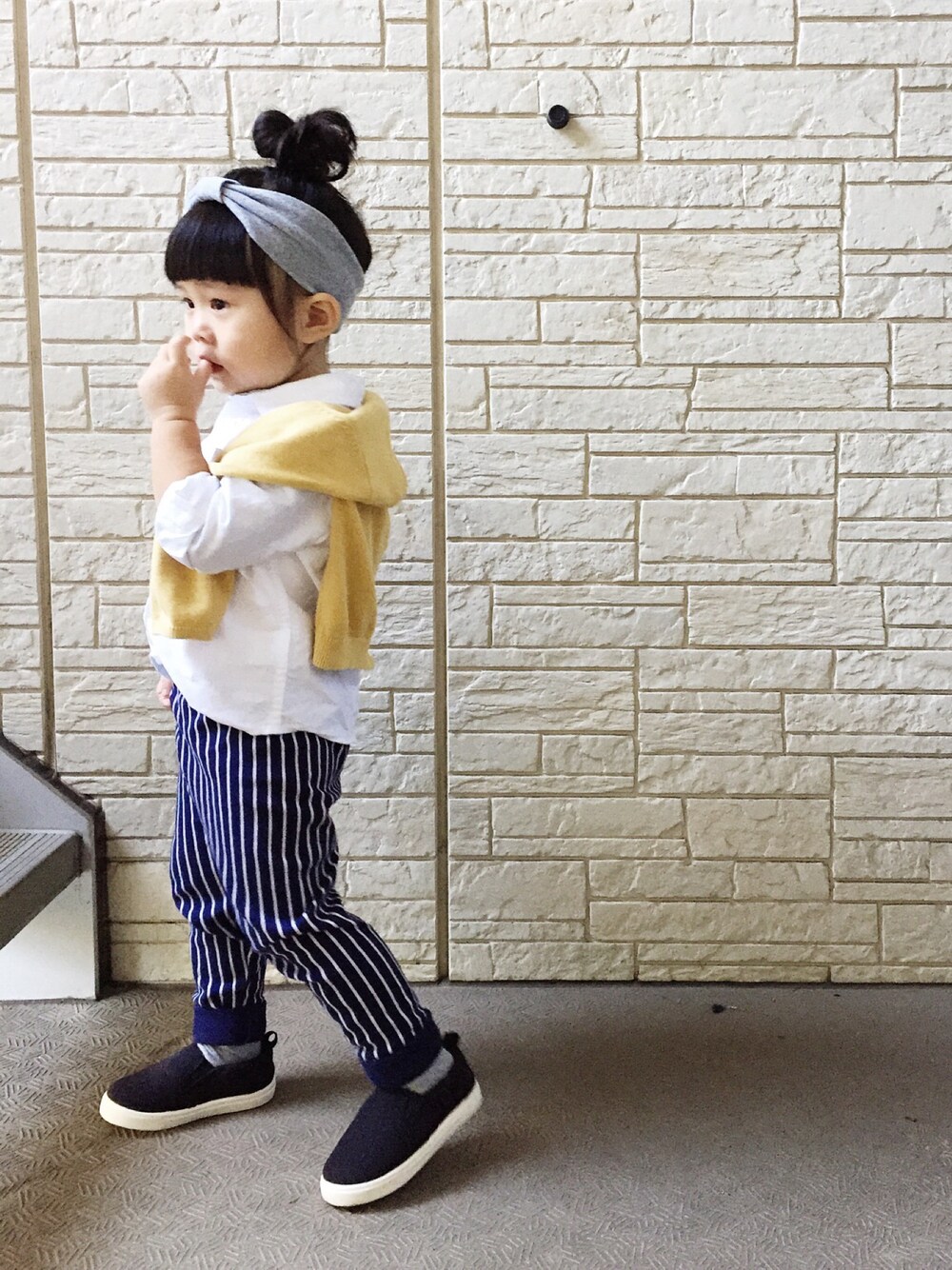 ヘアバンドは このあとすぐ取られちゃいました(^^;; UNIQLOストライプパンツかわいいっ! わたしも娘と同じコーデでおでかけ♡