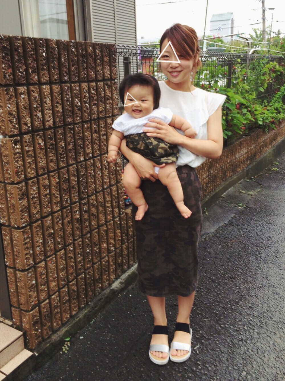 ▽おやこーで▽ 白トップス × カモフラ柄スカート やっと大好きなカモフラでおそろできたーーー😍😍😍❤️これがしたくて娘のスカート作りました✨私にしては上出来上出来!笑 雨で出かける予定ないのでお顔はすみませーん