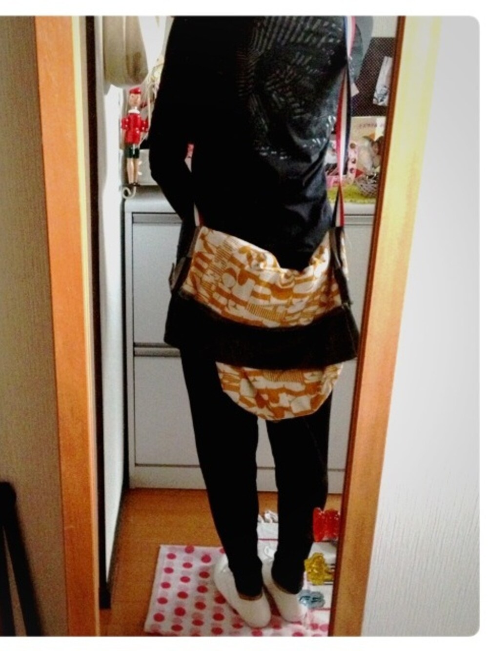 さっきまで部屋着で、近所のスーパーに買い物のため着替えたラフ過ぎる格好w この前作り終わったバック持って。 うん。GUの靴安いけどいい感じ。