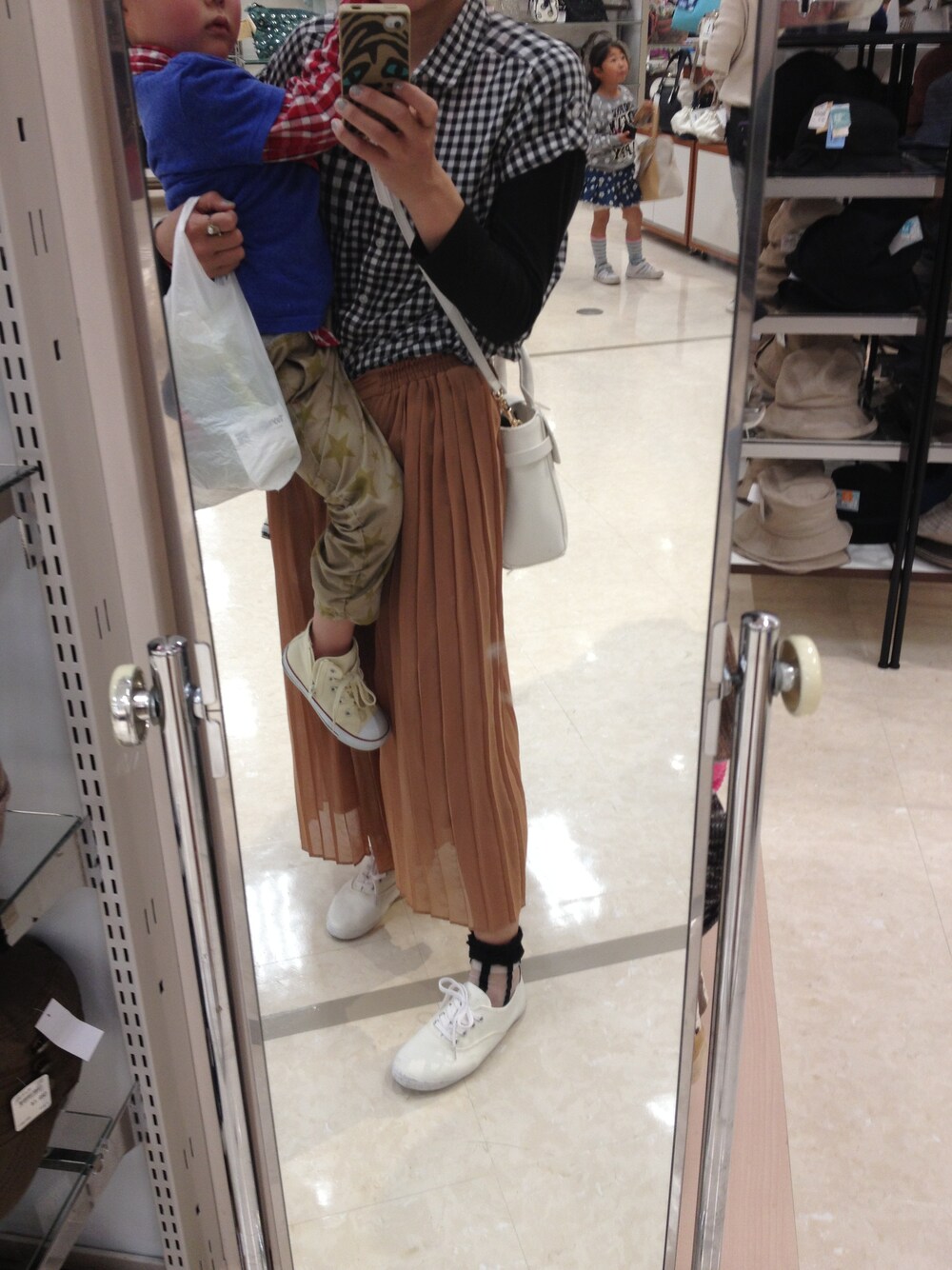 買い物先にてパシャり… 今日は息子くんの4歳の誕生日❤ 母ちゃん黒チェックで息子赤チェックイロチのオソロにしてみました。 18キロ重い…