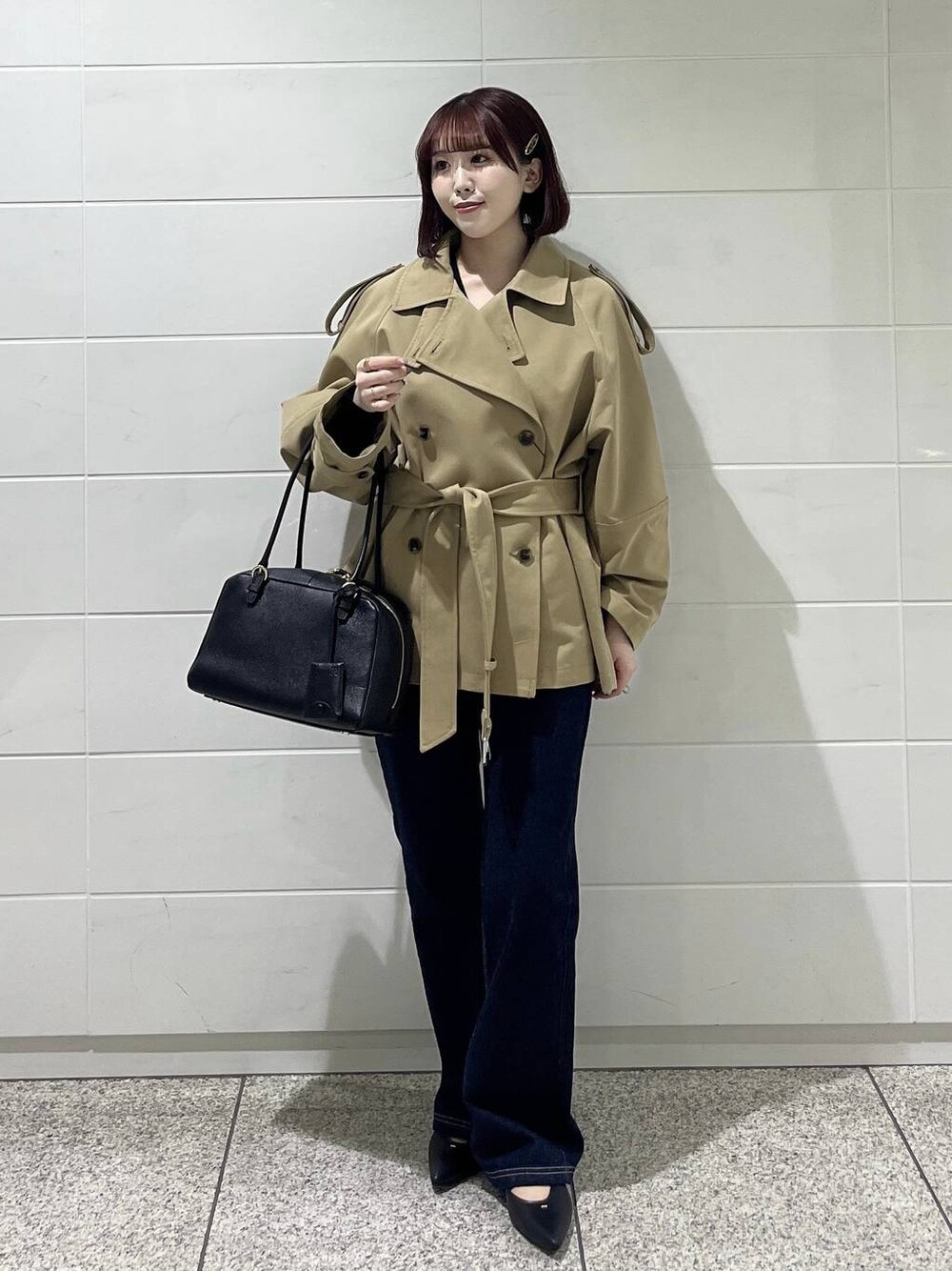 骨格ストレートの私の春アウターコーデ✨✨ 【アウター】 綺麗めな印象で着られるショート丈トレンチコート🌙 スタンドカラーにしたときに レザーが見えてくるデザイン🤎 スタンドネック、ステンカラー、トレンチカラー、 前を開けてなど、様々な着方が楽しめます🥺✨ ウエストベルトはリボン結びにしても可愛いです🫶🏻 【デニム】 大人気のKUROKIデニム♡ 国内生産の美シルエットのデニムパンツです💞 裾に向かってほんのり広がる、やや膝幅を狭くしたシルエット! 脚が長く、細く見えるようなゆるやかなカーブライン🙆♂️骨ストでもすっきり着られました🙌🏻