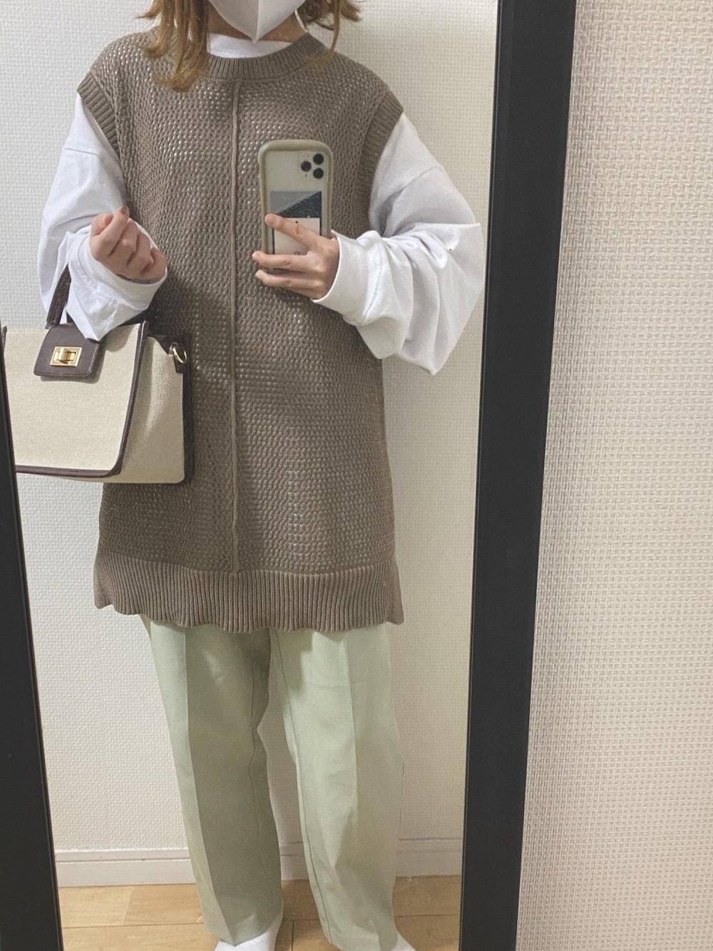 メッシュベストコーデ🦔 これから沢山活躍しそうな予感🙊 バッグあると大人っぽくなった気がします🌷 家の中で撮影したためシューズなしです。