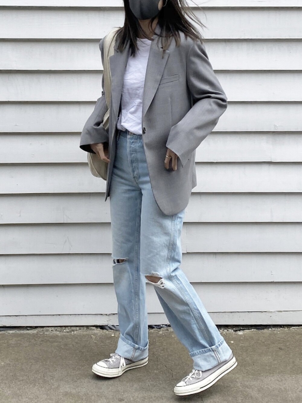 高身長さんが着るとコンサバに見えがちなジャケットをダメージデニムでカジュアルダウンしました。ジャケットはオーバーサイズを選ぶのがポイントです。
