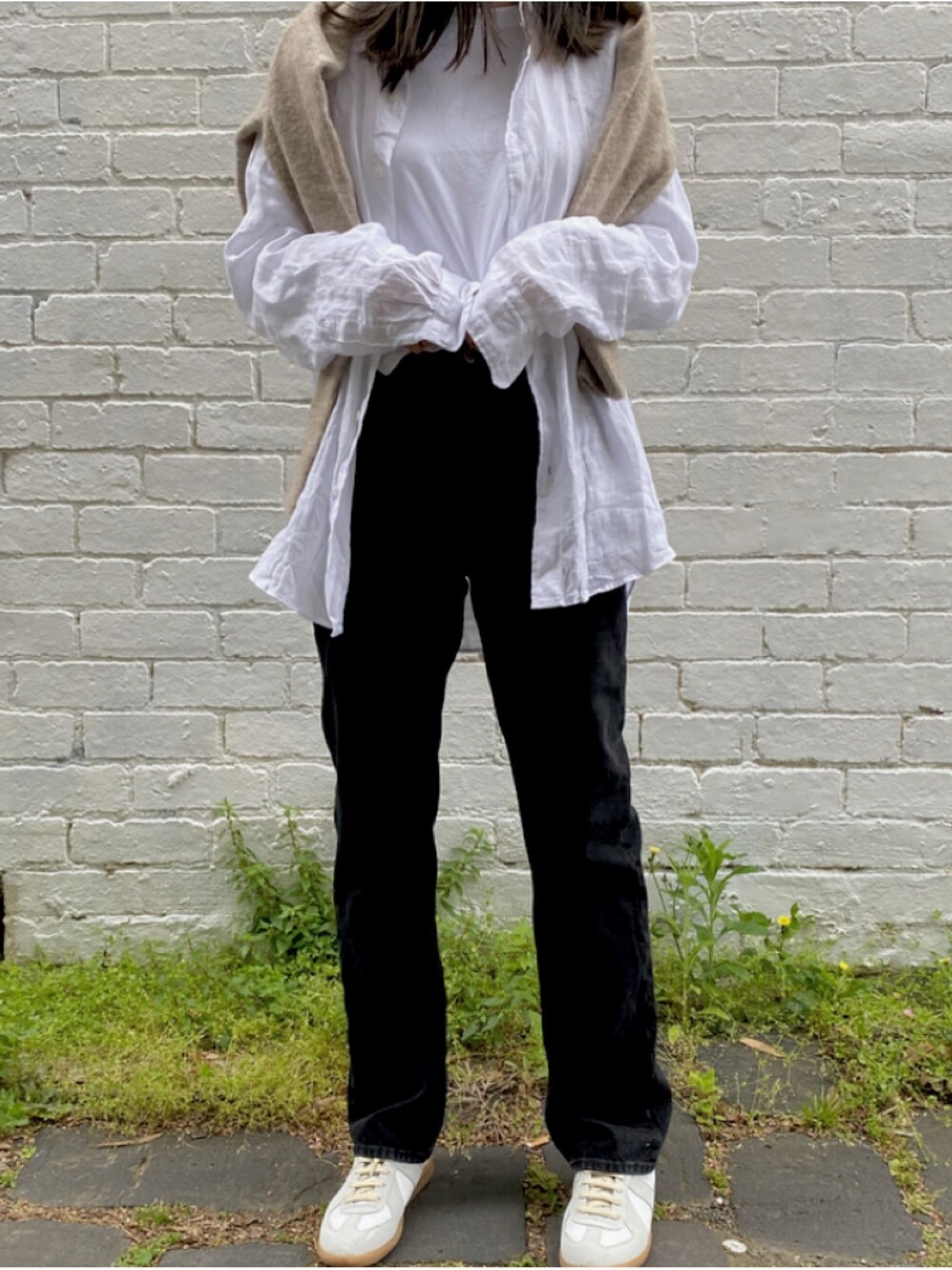 モノトーンコーデにベージュをプラスしてメンズライクなコーディネートに少し女っぽさをプラスしました。