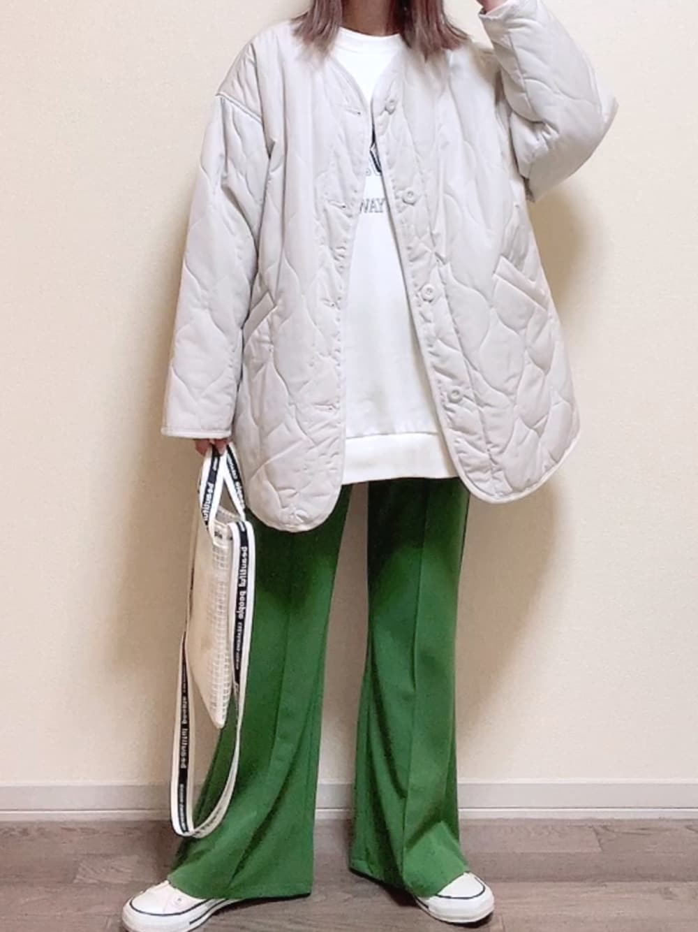 maiのノーカラージャケット「オーバーサイズノーカラーキルティングジャケット」を使ったコーディネート