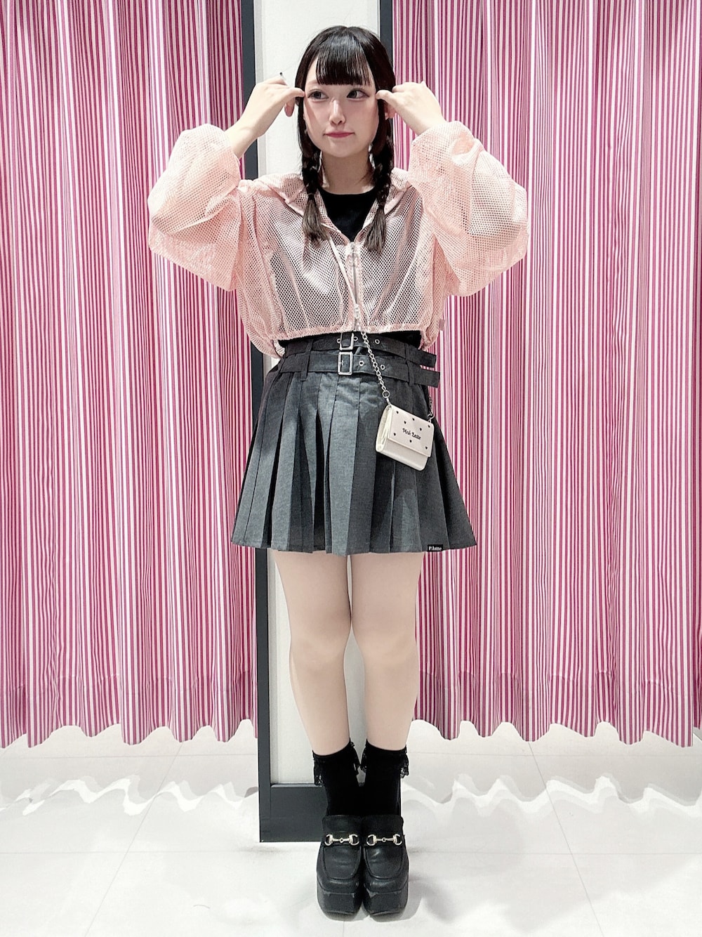 お友達と竹下通りに遊び行くみたいな、オシャレな場所に行く時に真似して欲しいスタイリングです♡ 羽織りはメッシュになっていて通気性抜群! 私はタンクトップと合わせて涼し気な印象に。 今どきな韓国っぽスポガーリーにしたい時はグレーのプリーツスカートがおすすめ♡