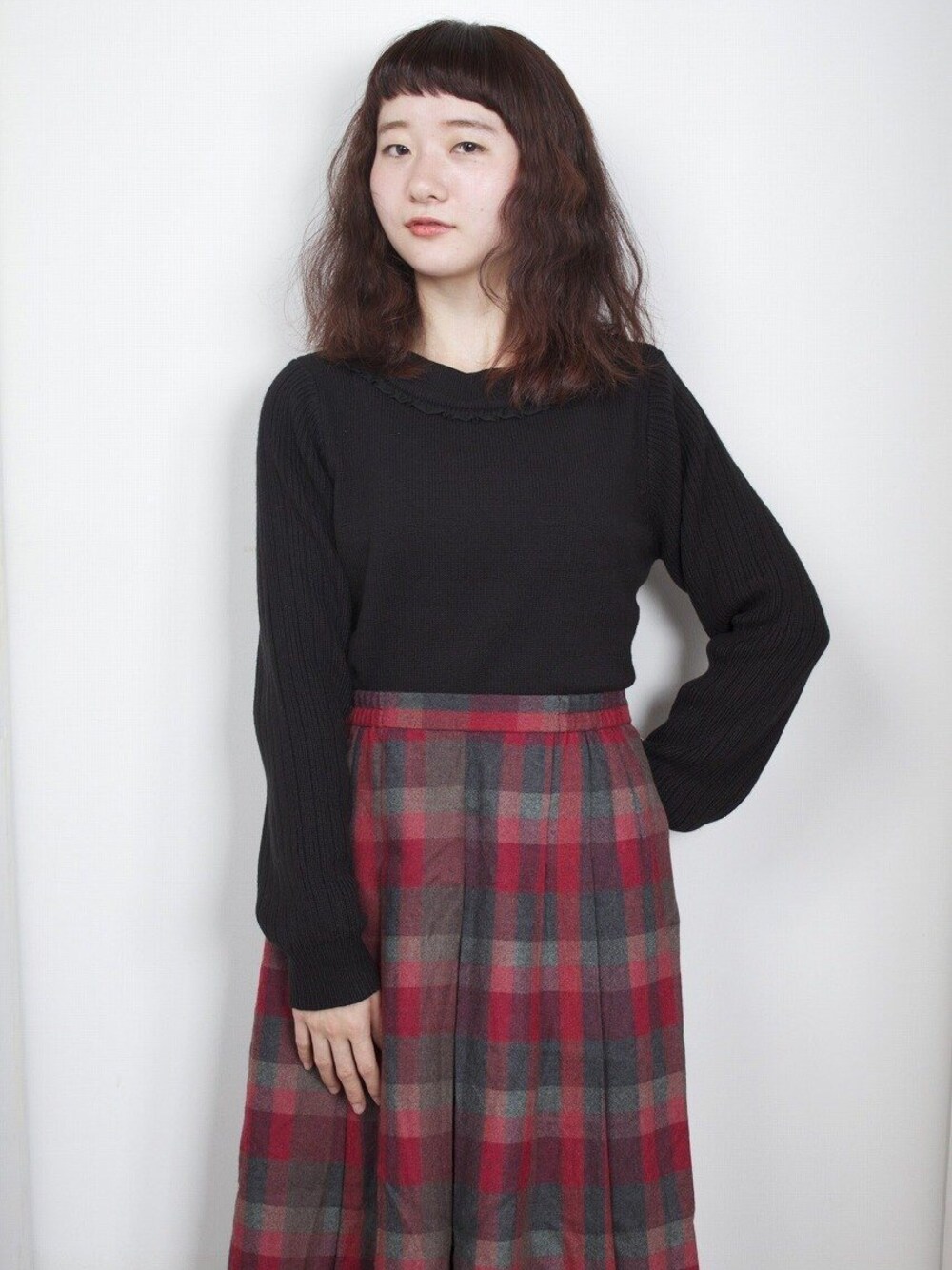 サロン撮影の時のコーデ* マジェのニットは首元のフリルが 可愛いのです♡♡ 古着のチェックスカートは とてもお気に入り。♡