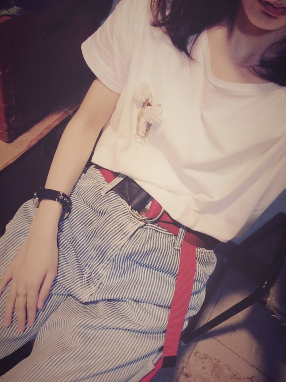 最近したコーディネート◎ 白Tシャツにストライプ柄の ペインターパンツで爽やかに◇ アクセントにオレンジの ベルトをしました(*^o^*)