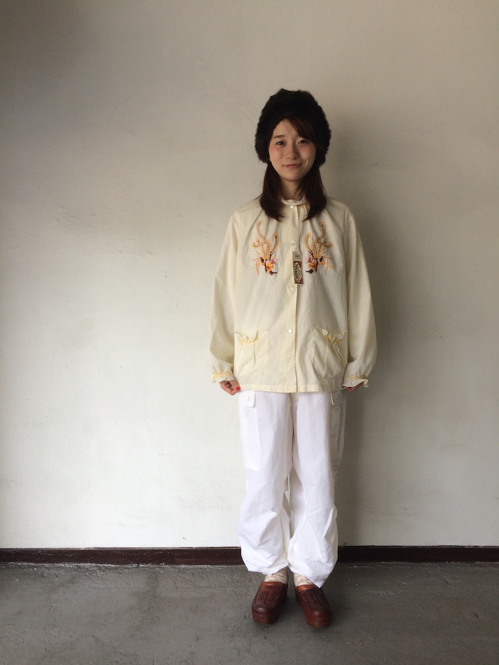 秋冬っぽいファー帽子に デザインが可愛いチャイナブラウスと アメリカ軍のだぼだぼパンツ、サボを 合わせました♪ 異世界観を出してみたくて 合わせてみましたが、 思ったよりしっくりきました◎ 入荷したばかりで商品見るのか とても楽しいです!!
