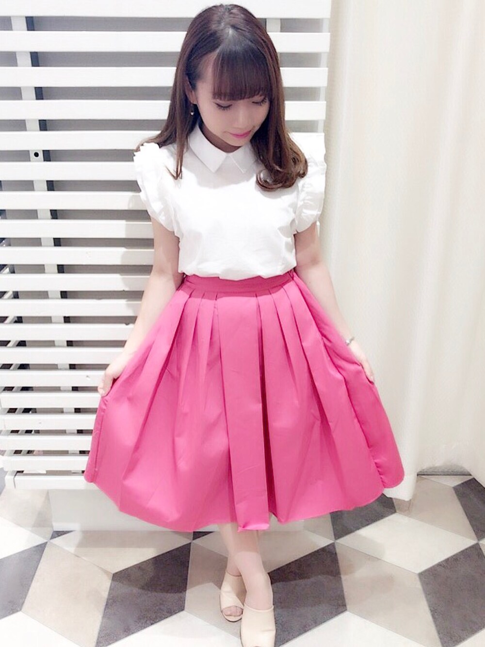 今期トレンドカラーのビビッドピンクを 用いたサマーコーデ☀︎ シンプルなブラウスと合わせて 綺麗めにまとめてみました♡