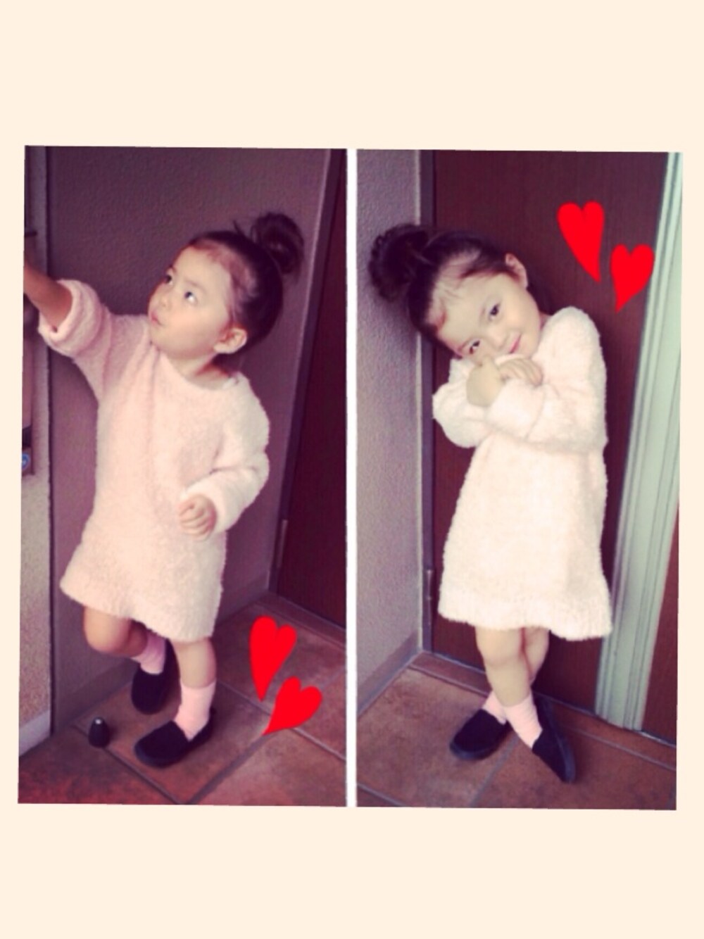 しまむらで130cmのTOPsを ぶかぶかにワンピにして着せてみました☻ ソックスもピンクに合わせてます♡