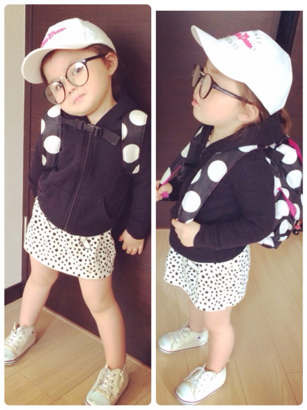ブラックコーデ♡ 春なのミニスカ生足で♡笑 重すぎないように春らしく 白のキャップをON♡ めがねをアクセんと♡ outer ameapp onepeace h&m shoes convers cap h&m
