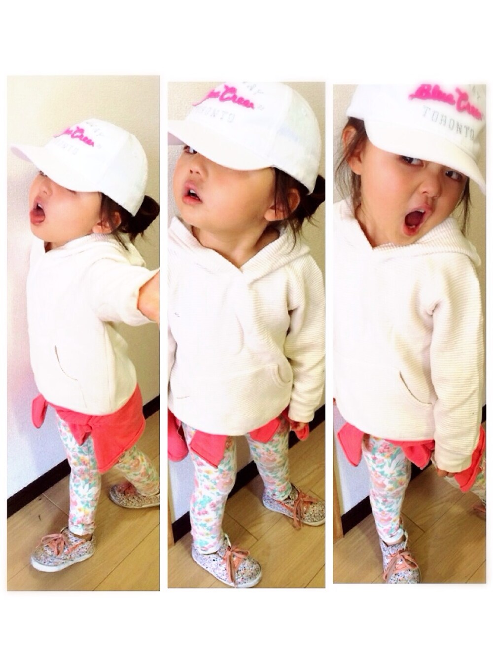 ホワイト系コーデにピンクを差し色♡ スポーティになりすぎないように花柄をミックスして女の子らしさを♡♥︎ トレーナー ameapp カーディガン h&m パンツ zara shoes zara キャップ h&m