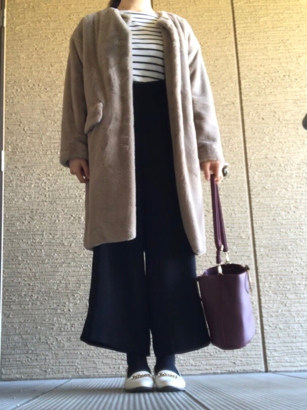 ファーコートはお値段の割にふわふわしていて触り心地よし♪ ただ、ちょっと毛が抜けてしまうので、黒い服と合わせるのは控えた方が良いかも〜