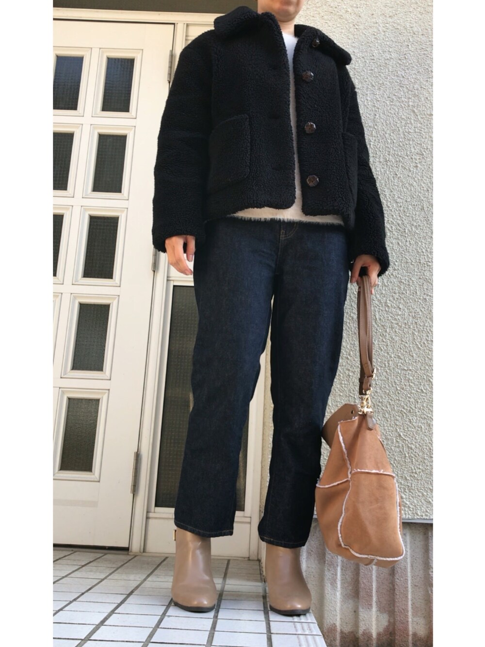 ZARAのモコモコアウターに、ゆるめのストレートデニムを合わせて 小物はベージュ系で軽さを出してみました☺︎
