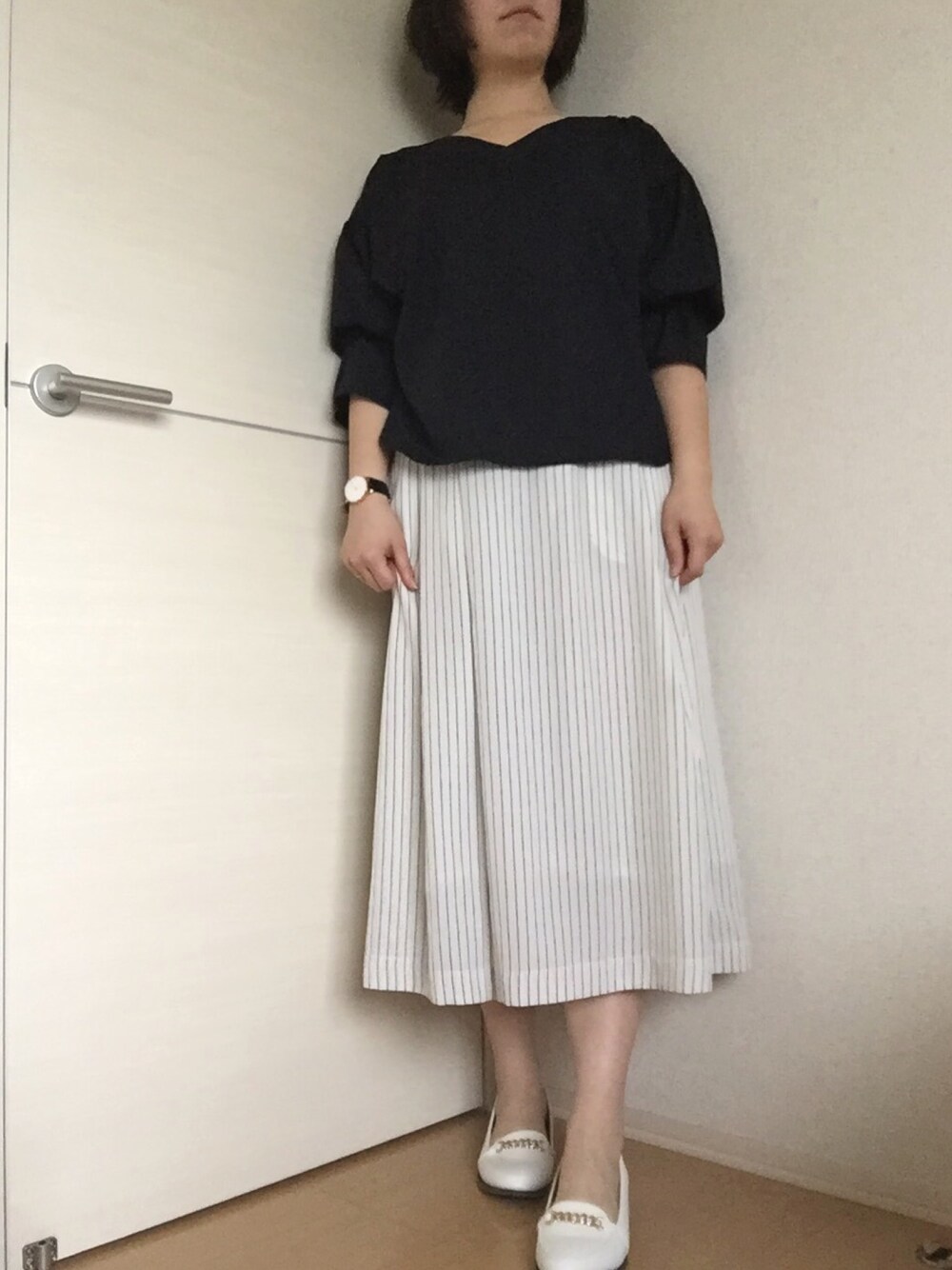 今日も地味な色味… だけど、パンツのストライプとモリ袖のおかげで地味過ぎないかな♪
