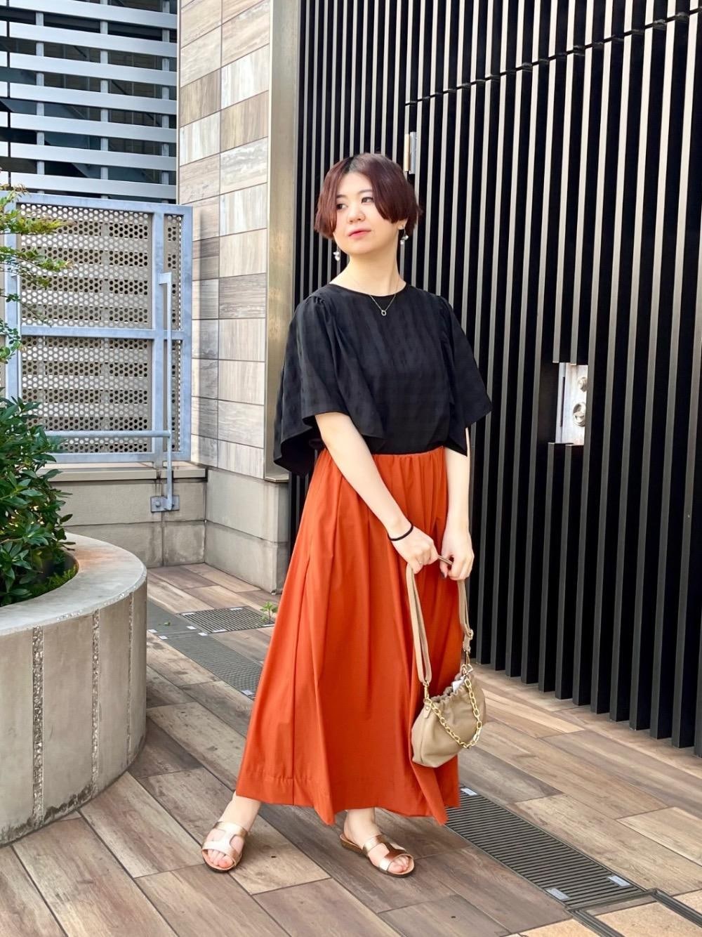 20代/162cm/普段サイズ:36~38/着用サイズ:38 【ギンガムギャザーフレアスリーブブラウス】 サイズ感 ▶︎ 38の1サイズ展開です。ややゆったりとした首周りと二の腕にかかるスリーブデザインが華奢見えします。中はノースリーブなので涼しく着て頂けます。 素材感 ▶︎ ポリエステル100%で仕上げているので風通しがよく軽い着心地です。シワになりにくいのでラフに着られます。 着用感 ▶︎ 暗めカラーのギンガムチェックが甘すぎず普段使いしやすいデザイン。素材感が軽いので暗めカラーでも重たくなりません。 【ナイロンストレッチタックギャザースカート】 サイズ感 ▶︎ 36と38の2サイズ展開、38を着用しています。ウエスト部分がゴムでゆったりしているので、快適な履着心地です。長すぎない丈感も使いやすさ◎ 素材感 ▶︎ シワが出来にくく、撥水加工・接触冷感の高機能が暑い時期や雨の多い季節に重宝します。自宅で簡単にお手入れできるのも嬉しいポイントです。 着用感 ▶︎ しっかりした生地感でありながら履いてみると驚くくらい軽く柔らかい履き心地で、とにかく快適です。形もタックとギャザーで綺麗に作られているので合わせるトップスを選ばず使いやすいです。