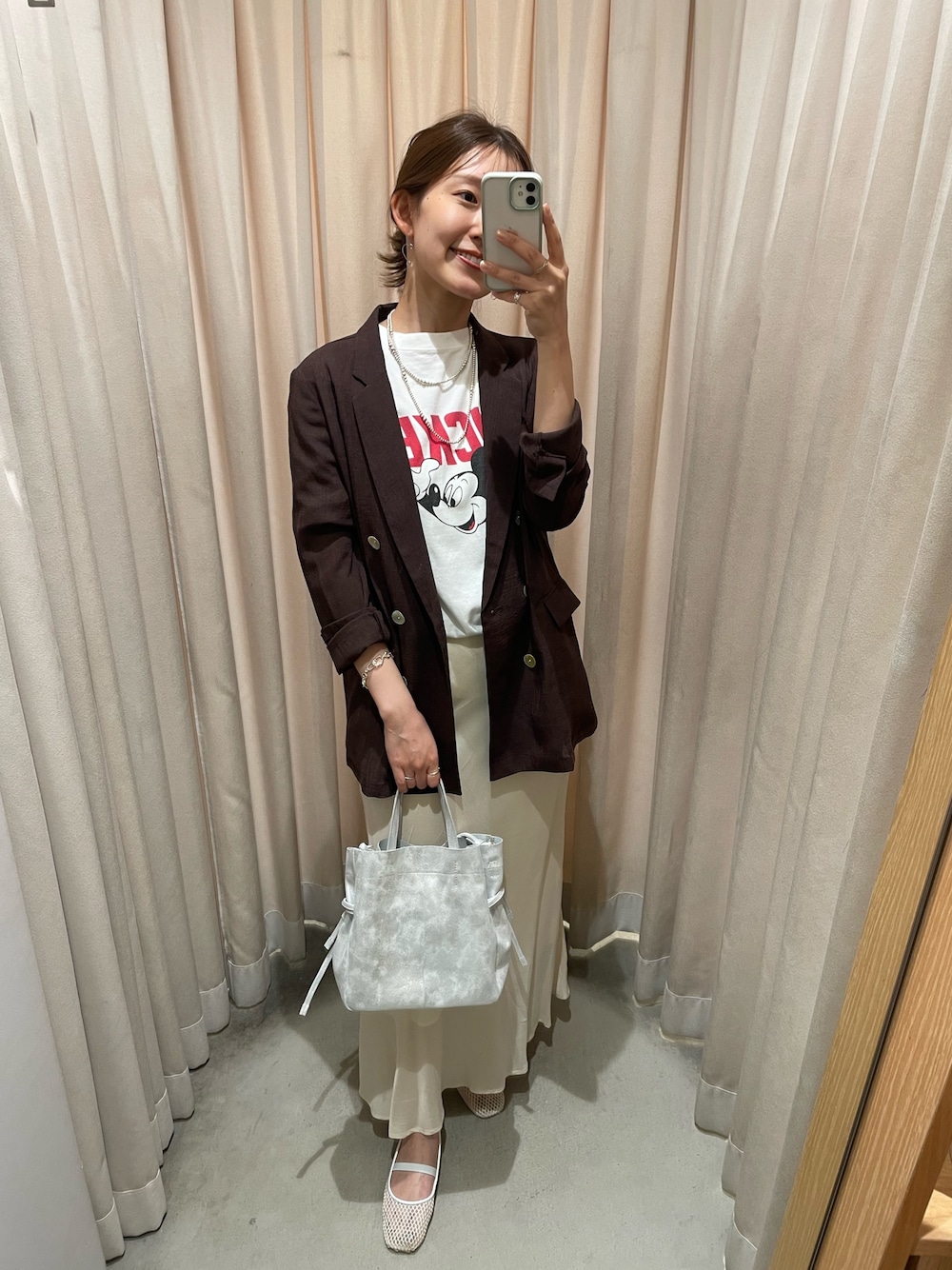 綺麗めなジャケットもTシャツ合わせで程よくカジュアルに◎ 38サイズはTシャツを中に着ても、 袖部分もごつきはありません☺︎ スカートは159cmで36サイズを着用しております!