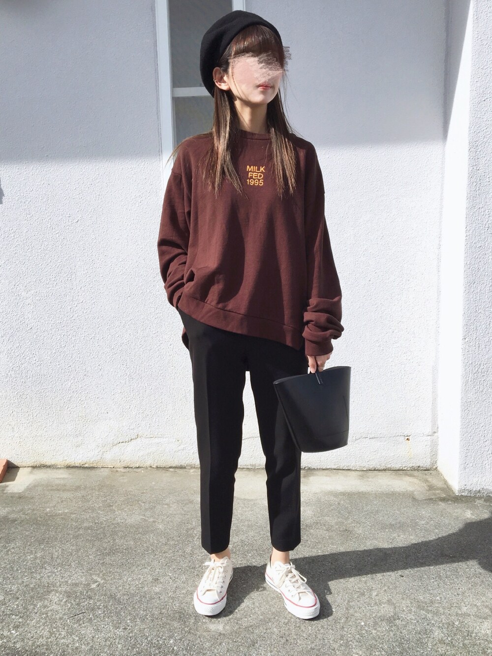 milkfed.のスウェットを最近よく着ています👏🏻✨ 眩しくてすごいしかめっ面だったのでモザイクしました。。笑 夜は寒いのでこれにグレーのコートを羽織ってしました。 見て下さりありがとうございます🙇✨ Instagram @mai_a_wear