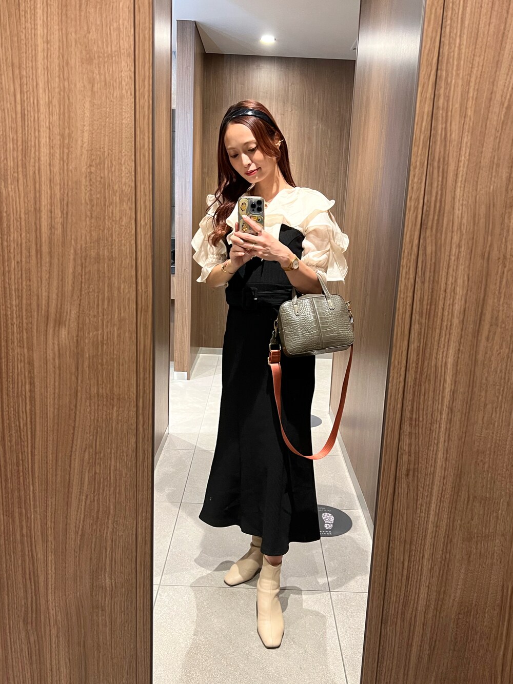 maiのブーツ「ストレスフリー/ソフトストレッチデザインヒールショートブーツ」を使ったコーディネート