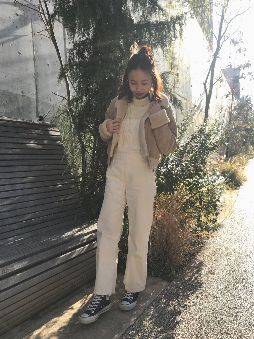 白のニットとサロペットでオールホワイトでした♡ コーデュロイのブルゾンを合わせてちょっぴりほっこりした感じに…🐻💛
