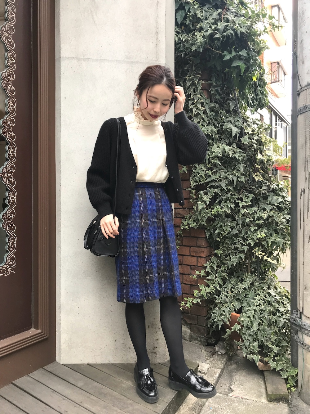 色もサイズもどんぴしゃだった青のスカート💕 タイトめだったので、ニットはボリューム感のあるFi.n.tのカーデを羽織りました😊 この時期とても頼りになる肉厚感💓ありがたい〜✨