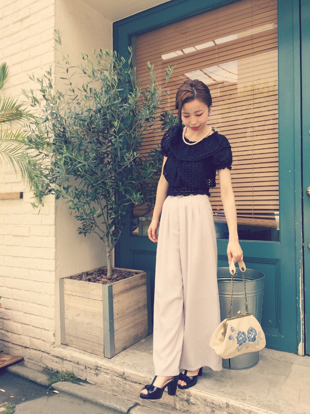 今日は蒸し暑かったので、涼しいレーストップスを選びました✴︎ ブラックでも透け感があるので、夏でも重たくならずお気に入りです(*^^*) ボリューム感のある形なので、今回は縦ライン強調のパンツを合わせました❤︎