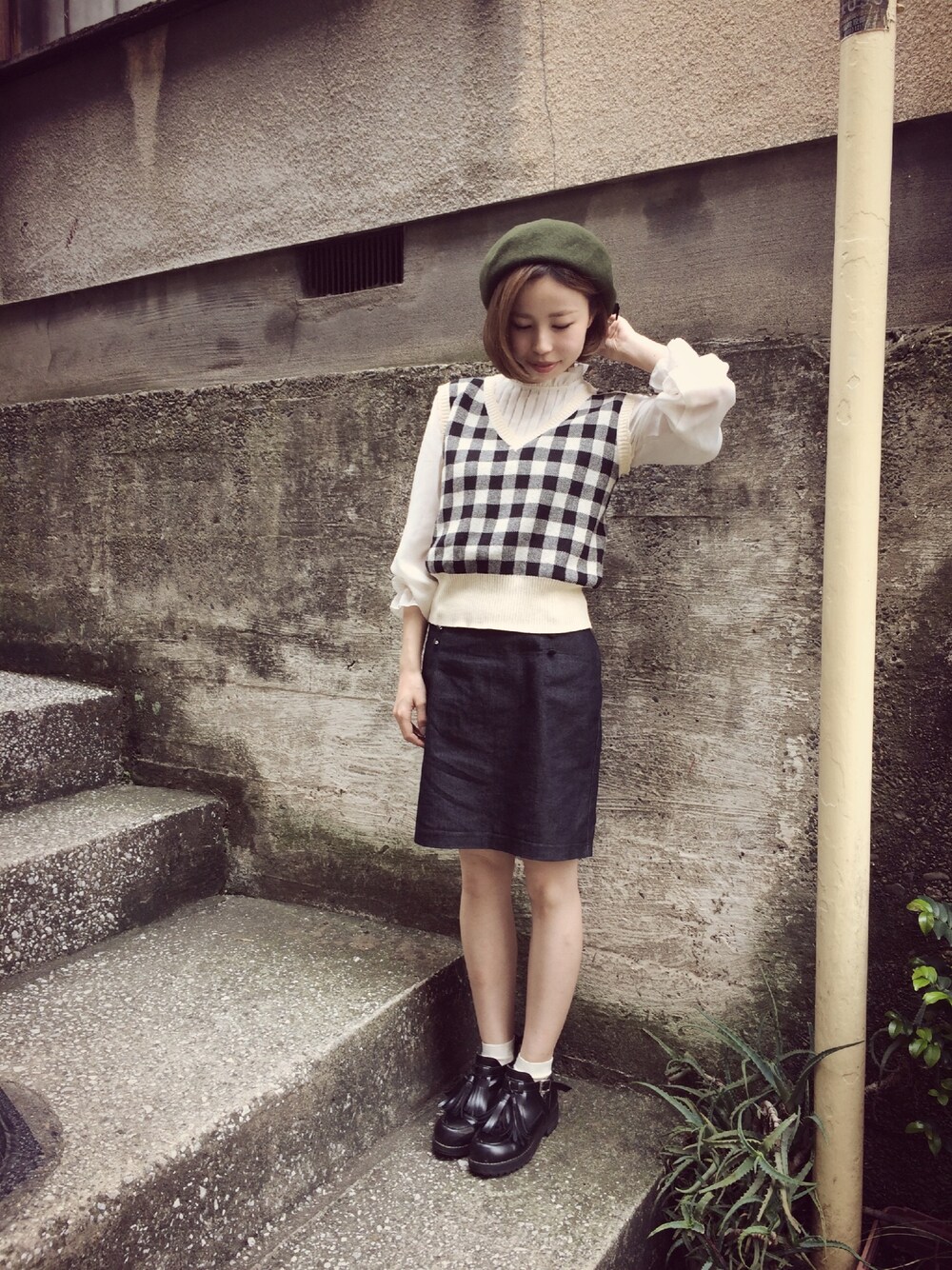 ブラックデニム、ワーキングブーツ、ニットベストでメンズライクに♡ その日の気分でフレアスカートに変えてガーリーに着たりしています(*^^*)